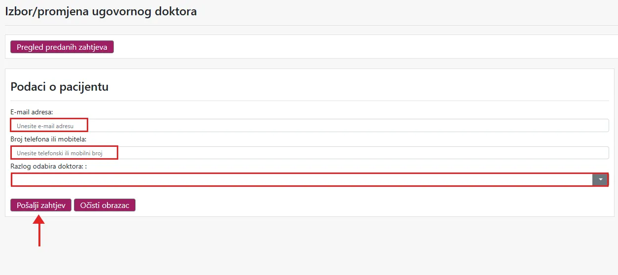 Upiši e-mail, broj telefona te odaberi razlog odabira doktora.